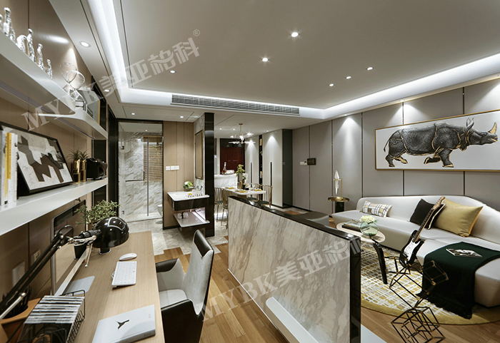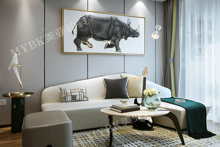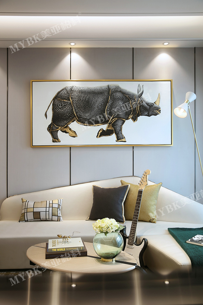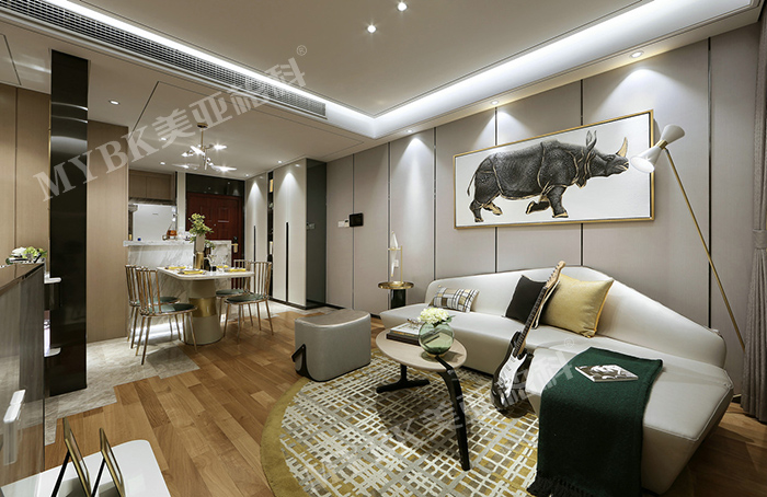 空間寧靜的外表下藏著一顆熾熱的內心,撲面而來的輕奢優雅,質樸自然的現代設計融合當代美學理念,營造出一種輕奢的生活氛圍。在創造空間質感的同時,一點綠色來出挑活潑的感覺,調和出愜意的生活。